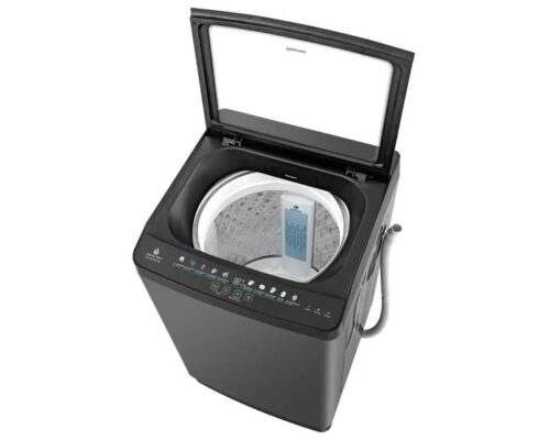 Máy giặt Hisense 13 kg WTJH1313UB có kiểu dáng cửa trên – lồng đứng, cùng màu xám kết hợp dễ dàng với nội thất trong nhà.