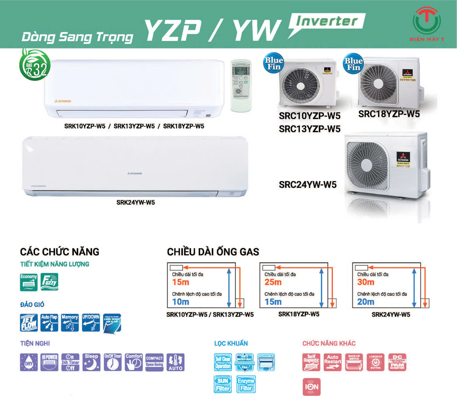 - Chiều cao lắp đặt tối đa giữa cục nóng-lạnh: 10m.